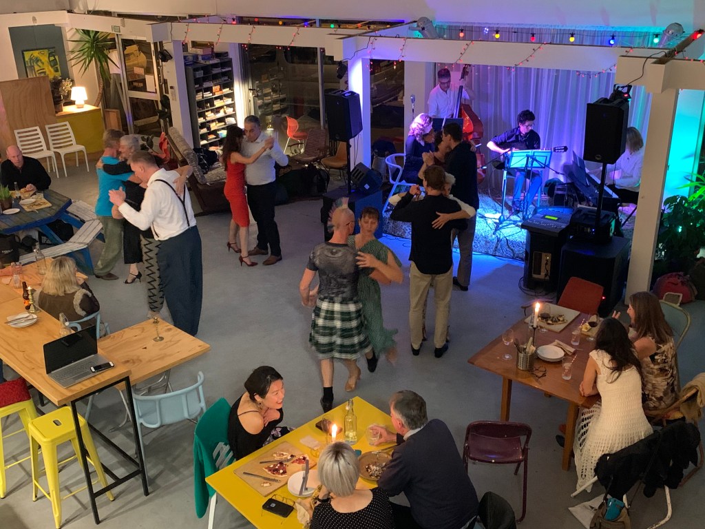 I have always thought since having Gloria the little red Caravan, that I could have a roll-out dance floor and park up at the beach somewhere early evening, and serve food and have tango dancing outside…lessons maybe and a brazier…so far it hasnt happened but now there is Firebird the Cafe and one awesome customer (thanks Grace!) introduced me to a tango teacher who would teach there. Not only, but also, another visitor brought a Wellington Tango band into my periphery and now we are only to have the dance floor made – and voila! Tango at the Bird!!